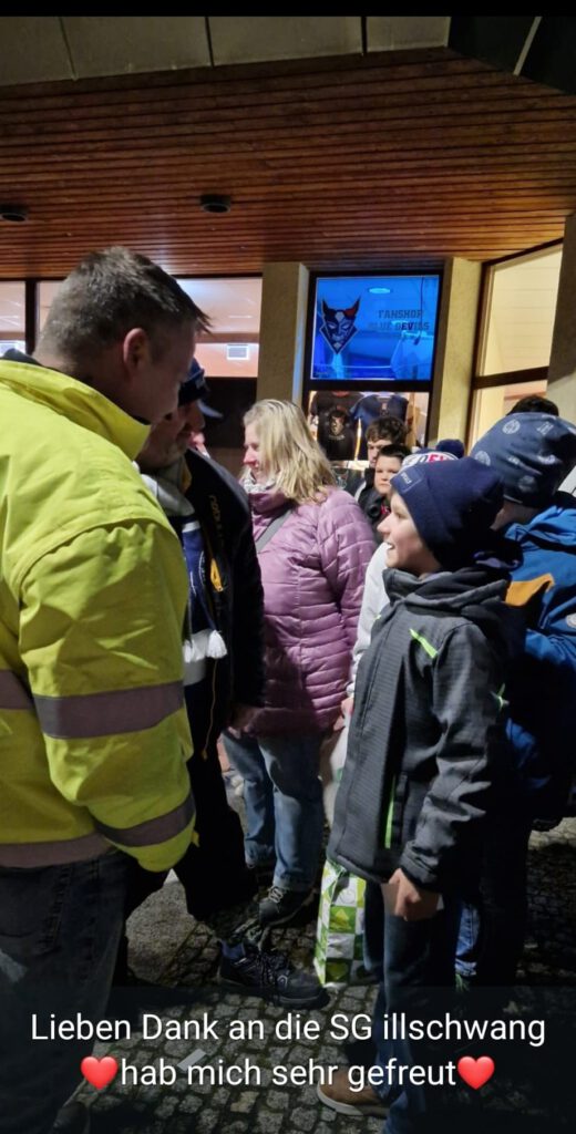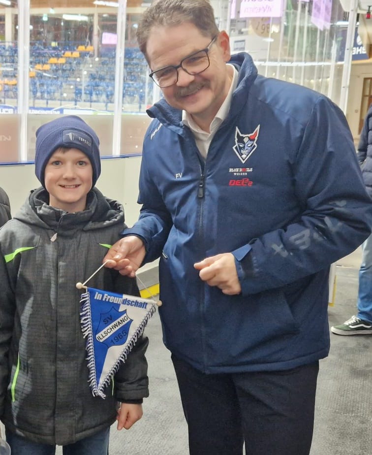 Nach dem Schlusspfiff kam es zu einer netten, kleinen Geste: U13 Kapitän Toni übergab im Namen der gesamten Mannschaft einen Vereinswimpel des SV Illschwang an den 1. Geschäftsführer der Blue Devils, Franz Vodermeier – direkt vor der Eisfläche. Ein Moment, der bei allen Beteiligten einen bleibenden Eindruck hinterließ.