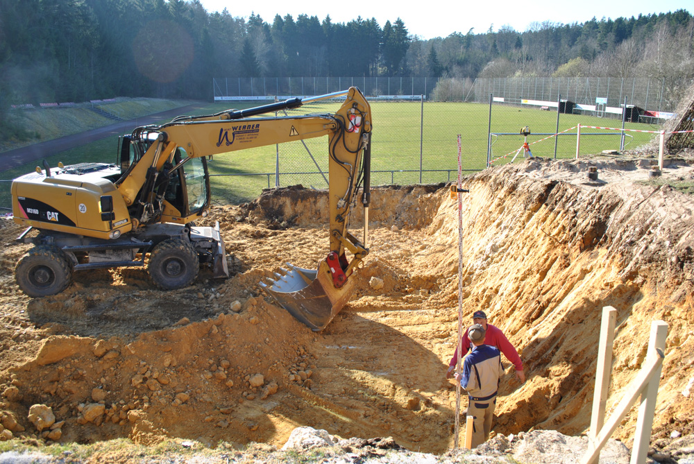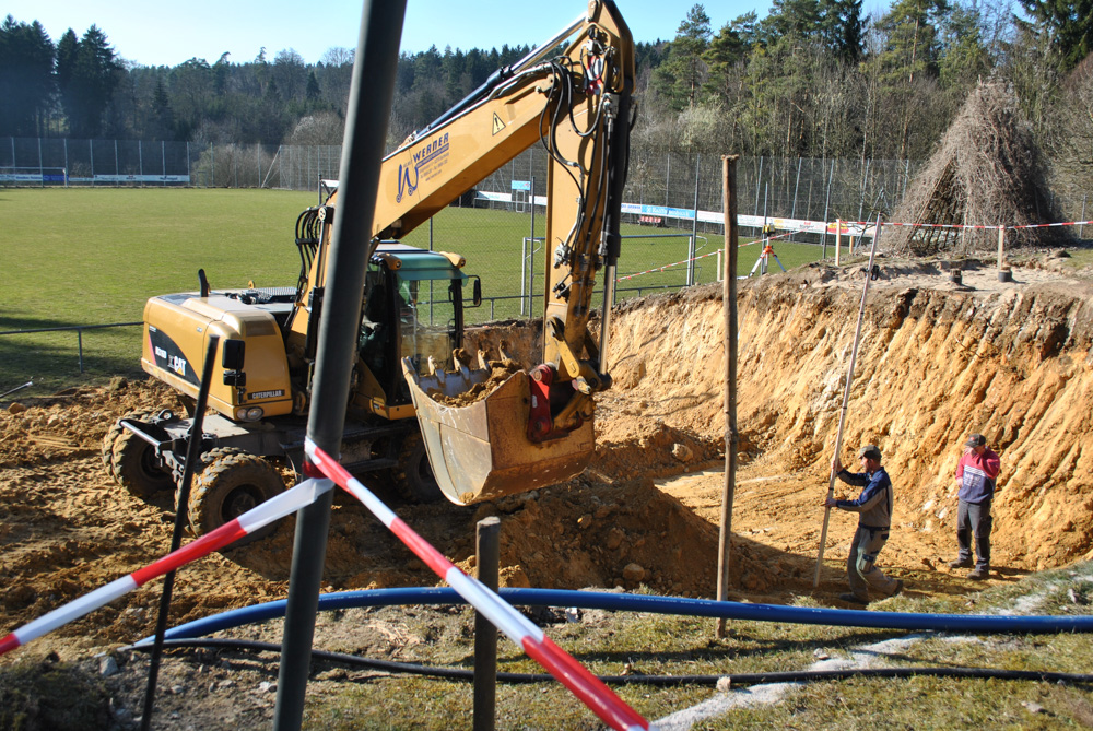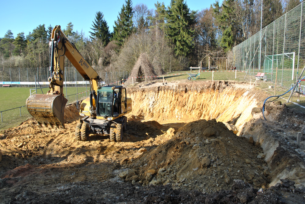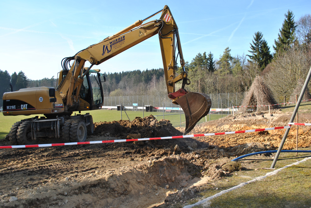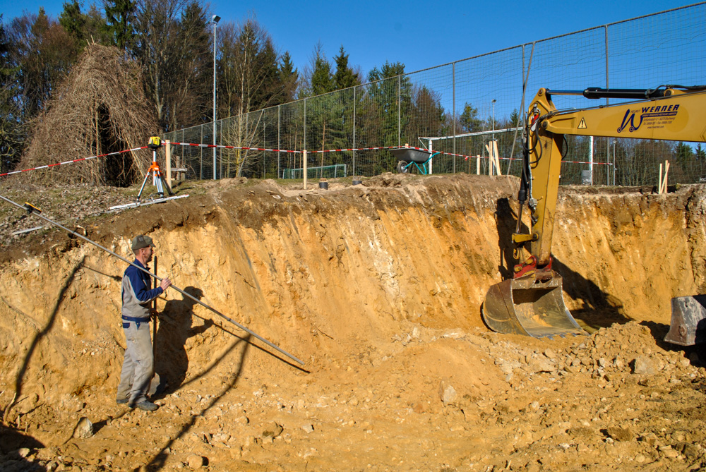 Und dann ging’s los mit dem Ausheben der Baugrube zwischen dem A-Platz unten und dem B-Platz oben. Und wer sonst könnte die Arbeiten begleiten, nachdem er bereits alles vermessen und vorbereitet hat? Natürlich unser Herbert, wer sonst.