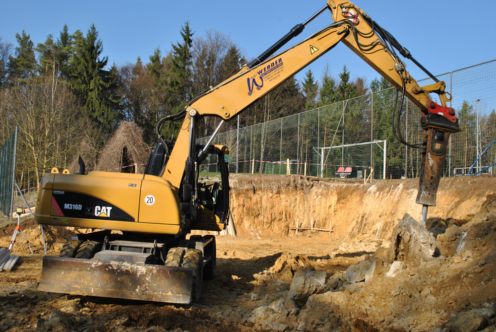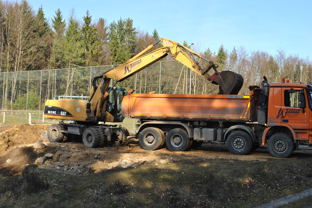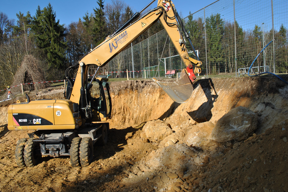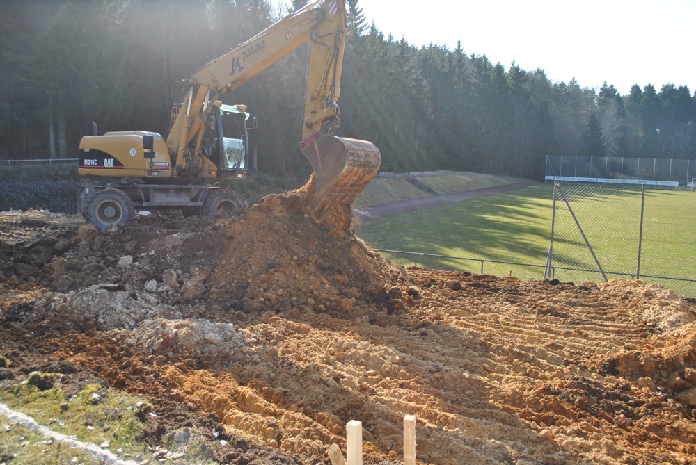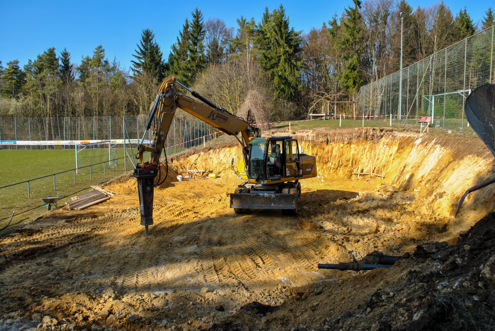 Und dann ging’s los mit dem Ausheben der Baugrube zwischen dem A-Platz unten und dem B-Platz oben. Und wer sonst könnte die Arbeiten begleiten, nachdem er bereits alles vermessen und vorbereitet hat? Natürlich unser Herbert, wer sonst.